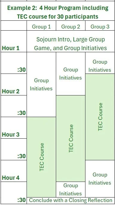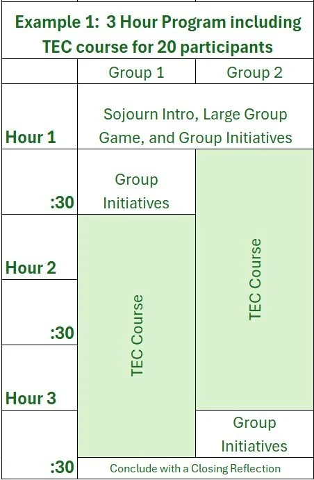 The Team Enrichment Challenge (TEC) Course is a great option for certain groups! Teams are guided through six different challenge stages as they’re suspended 55 feet above the ground. The TEC course takes approximately 90-120 minutes for each group of 10 participants to complete (though up to four groups can be moving through the course simultaneously).